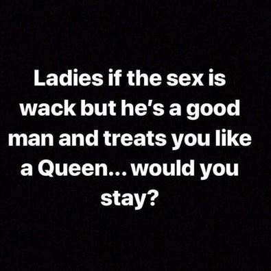 "Ladies if the s*x is wack but he's a good man and treats you like a Queen... would you stay?," she posted on social media and this has sparked conversations.