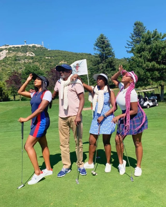 In photos shared on their pages, the family is seen as they go golfing in the country and though we’re not quite sure of his daughters’ golfing skills, we’re definitely sure of the billionaire’s as he shared a video of himself potting a shot.