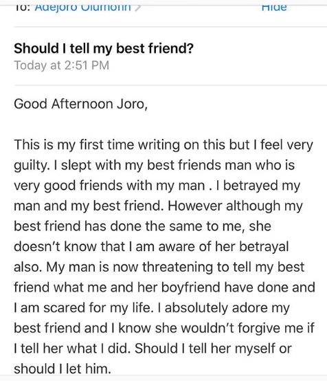 Relationship blogger and adviser, Joro Olumofin has shared the story of a lady who is presently feeling down after having a taste of her best friend's man.