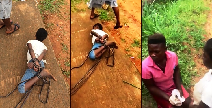 A Facebook user, Sen Somto Saint Okafor has taken to social media to share videos showing a young girl in Anambra State, who was tied up by her mother, for not sweeping.