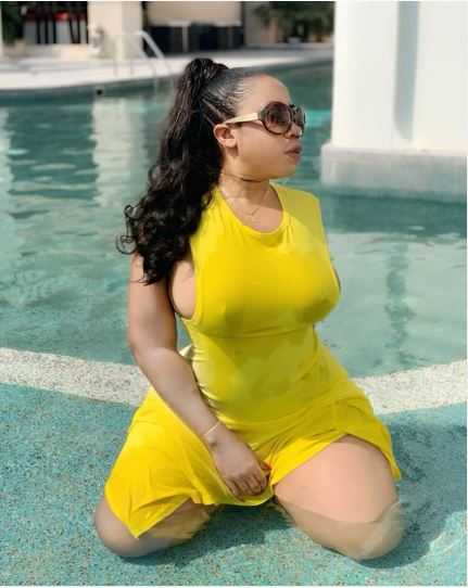 The reason isn't farfetched. The brief and curvy Lagos socialite wasn't wearing her bra and her nipples could be clearly seen in the yellow dress as she knelt in a swimming pool.