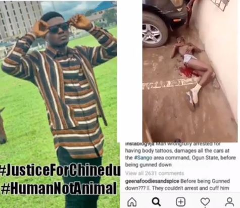 It was gathered that Chinedu was shot after he had destroyed windscreens of cars parked at the police station after being wrongfully arrested and harassed for having tattoos.