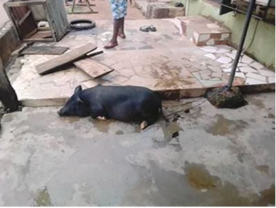What ordinarily looked like a good gesture from the young Tersur, however, turned tragic when he slumped immediately after taking the pig out of the gutter.