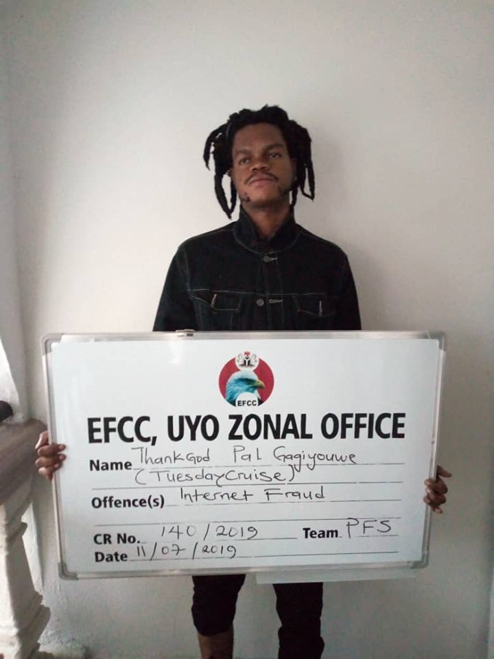 Thankgod, a 25-year-old entertainer with the stage name “Tuesday Cruise” was arraigned on July 24, 2019, by the Uyo Zonal Office of the Economic and Financial Crimes Commission, EFCC, on a one-count charge.