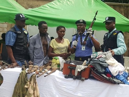 Speaking during the parade, the Force Spokesman, DCP Frank Mba said: “A mother and a wife, Simeon Esther was arrested in Ondo State for being in possession of one AK47 Rifle and 18 rounds of live ammunition.