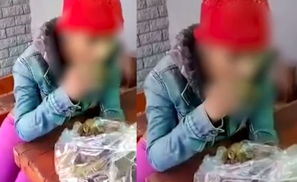 The victim, who moans and struggles to stomach the contents, is then told: "Swallow, you are taking too long, take another piece."