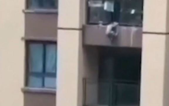 In the tense video captured by a neighbour, the child was seen clinging to the building, legs dangling in a futile attempt to hold on.
