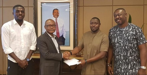 (From L-R) Super Eagles player, John Ogu, group managing director of Dangote Industries Limited, Olakunle Alake;