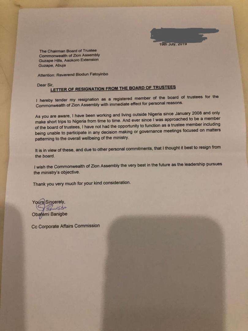 In a letter addressed to Pastor Biodun Fatoyinbo dated 19th July, Obafemi Banigbe communicated that he was no longer interested in being a member of the COZA Board of Trustees “with immediate effect and for personal reasons.”