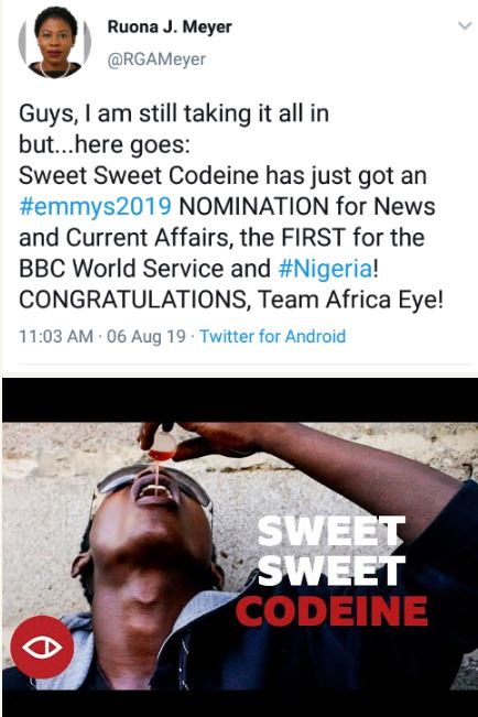 “Guys, I am still taking it all in but…here goes: Sweet Sweet Codeine has just got an #emmys2019 NOMINATION for News and Current Affairs, the FIRST for the BBC World Service and #Nigeria! CONGRATULATIONS, Team Africa Eye!” she wrote.