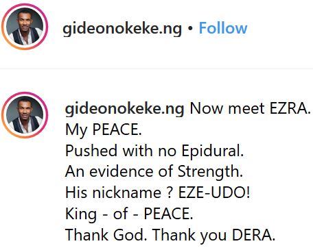 Taking to his Instagram page, Gideon penned a sweet note introducing Ezra to the world as he praised his wife’s strength: