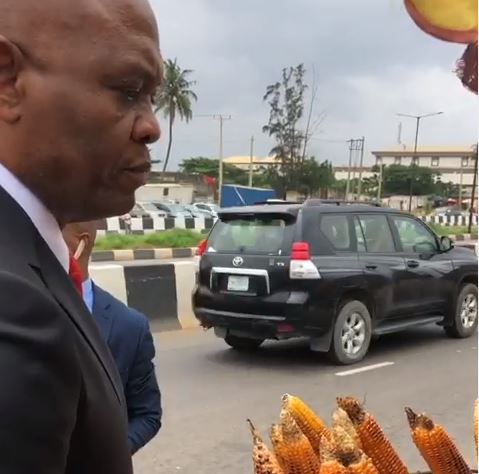 Tony Elemelu has taken to the Lagos express to sample corns after developing a craving while on his way to a meeting.