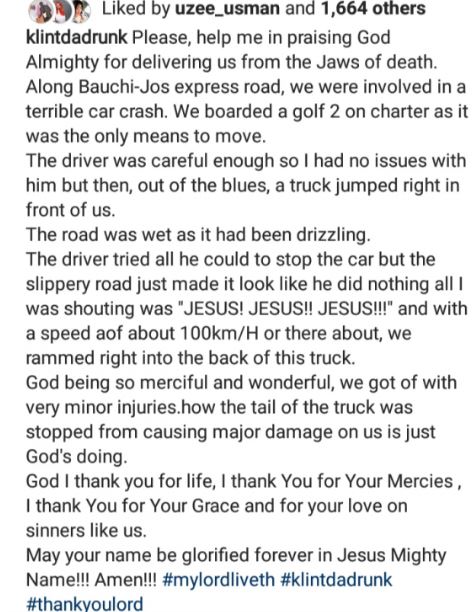 The road was wet as it had been drizzling. The driver tried all he could to stop the car but the slippery road just made it look like he did nothing all I was shouting was “JESUS! JESUS!! JESUS!!!” and with a speed of about 100km/H or there about, we rammed right into the back of this truck. God being so merciful and wonderful, we got of with very minor injuries. How the tail of the truck was stopped from causing major damage on us is just God’s doing. God I thank you for life, I thank You for Your Mercies , I thank You for Your Grace and for your love on sinners like us. May your name be glorified forever in Jesus Mighty Name!!! Amen!!! #mylordliveth #klintdadrunk #thankyoulord .”
