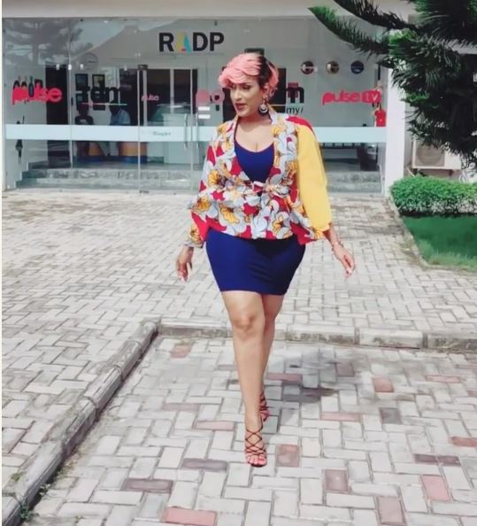 She rocks a skimpy skirt with ankara sewn jacket all looking so glamorous.