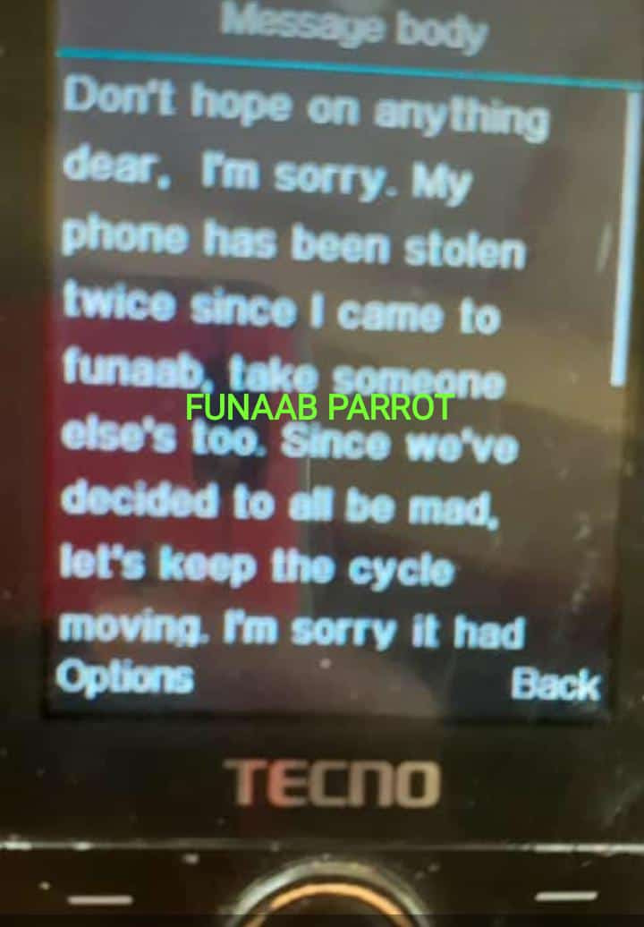 A Twitter user shared a message his schoolmate at the Federal University of Agriculture Abeokuta (FUNAAB), got from a phone thief after the number was called repeatedly while searching for the missing phone.