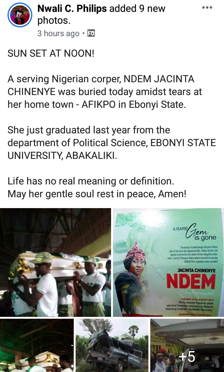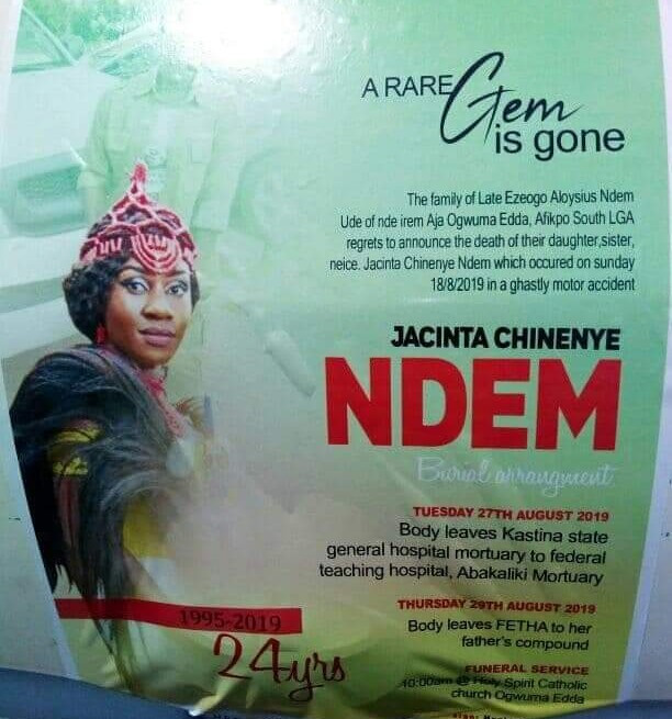 Jacinta Chinenye Ndem was in a bus belonging to the National Association of Catholic Corps members (NACC) when they were involved in a car crash on Sunday, August 18, and she lost her life.