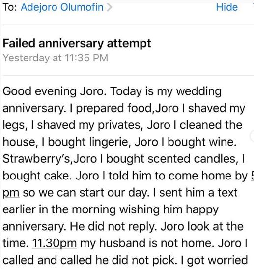 A married woman with kids has recounted how her planned marriage anniversary failed following her husband's absence.