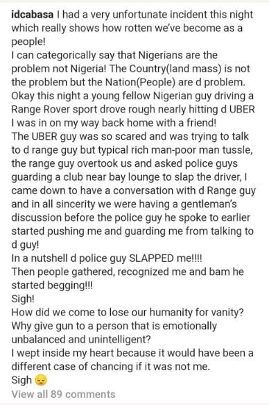 The UBER guy was so scared and was trying to talk to d range guy but typical rich man-poor man tussle, the range guy overtook us and asked police guys guarding a club near bay lounge to slap the driver, I came down to have a conversation with d Range guy and in all sincerity we were having a gentleman’s discussion before the police guy he spoke to earlier started pushing me and guarding me from talking to d guy!