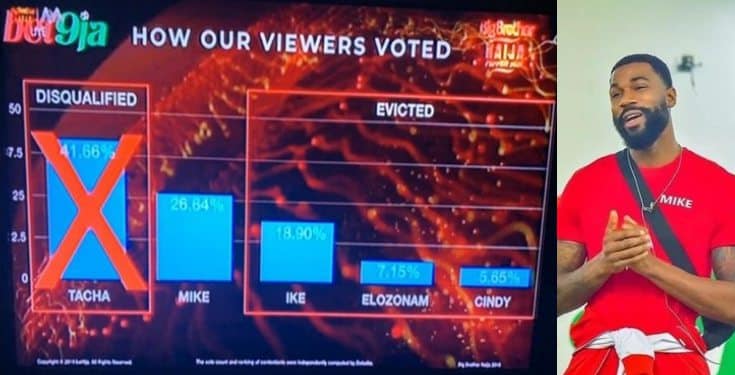 Mike came second with 26.64% vote and Ike who came third with 18.90% votes, was evicted on Sunday.