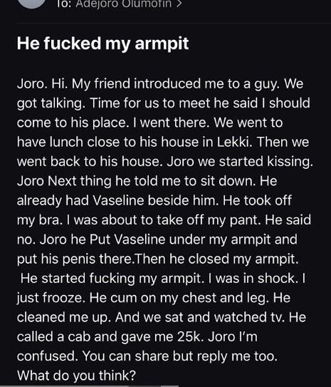 The young man she met in the highbrow Lekki area inserted his manhood in the unthinkable area, her armpit. He applied some vaseline on it and ignored her v*gina and he started thrusting.