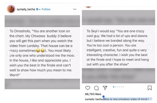 However, Tacha who seemed to have had a misunderstanding with almost all the final five housemates, on Sunday took to her Instagram page to wish them well.