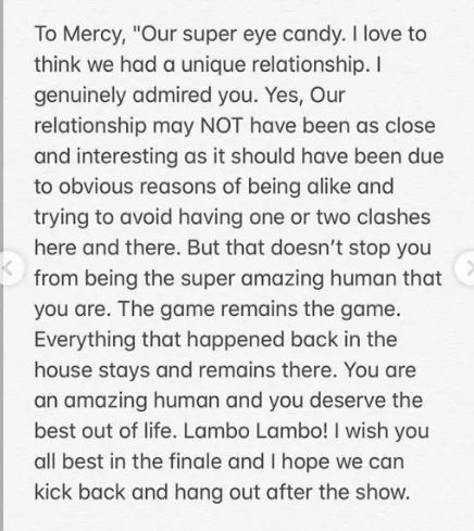 She also stated what she admired in each one of them, even as she wished them the best and hoped to hang out with them outside the house, including Mercy.