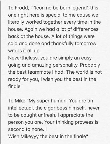“I’ve also had a while to think about what I would have said to the last 5 big Brother Naija housemates in the house before leaving. In light of the finale, I would love to get these thoughts off my chest.”