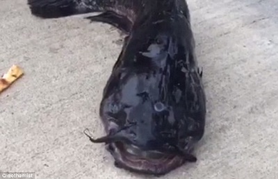 According to the dailymail.co.uk a video released online shows a three-eyed fish caught by a fisher man. The video which has gone viral and shot by Greg Hunter shows the three-eyed catfish on the floor captured in Gowanus Canal in Brooklyn.