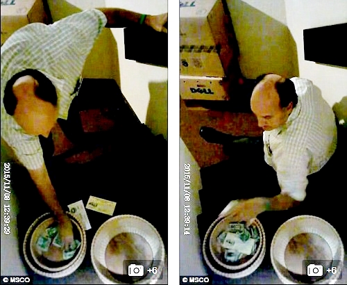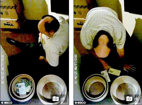 The surveillance footage also captured him approaching the offering baskets in a storage area and brazenly grabbing handfuls of bills. He then appears to leave before returning twice to clear out every last coin from the collection.
