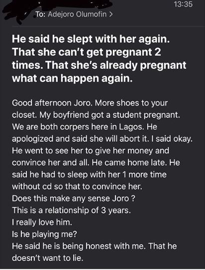 Relationship adviser and blogger, Joro Olumofin has shared the story of a lady who is unhappy about how her boyfriend cheats.