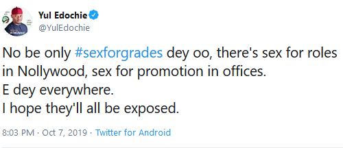 “No be only #sexforgrades ‘dey oo,’ there’s s*x for roles in Nollywood, s*x for promotion in offices. ‘E dey everywhere. I hope they’ll all be exposed,” he wrote on his Twitter handle.