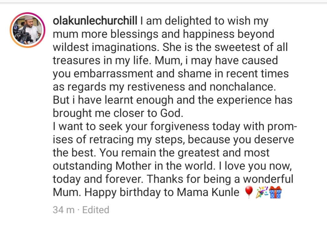 Not specifying what he is asking for forgiveness for, Churchill wrote: "I am delighted to wish my mum more blessings and happiness beyond wildest imaginations. She is the sweetest of all treasures in my life. Mum, i may have caused you embarrassment and shame in recent times as regards my restiveness and nonchalance. But i have learnt enough and the experience has brought me closer to God.