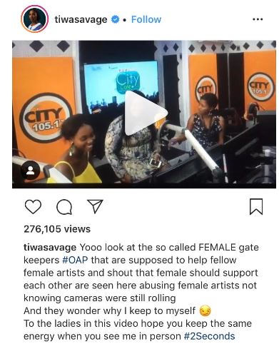Nigerian popular singer, Tiwa Savage, has called out On-Air Personalities caught slandering her and other female artistes.