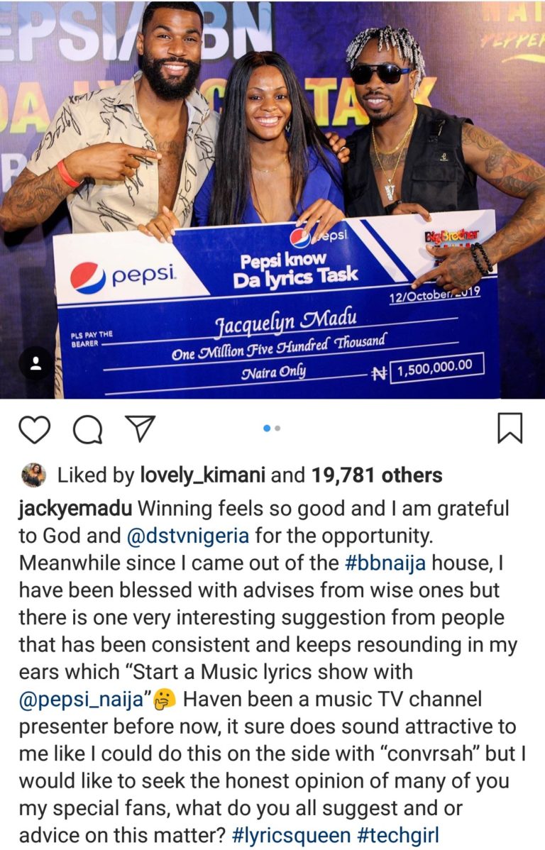 Former Big Brother housemate, Jacquelyn Madu aka Jackye has received her N1.5 million cash prize including an all-exspense-paid trip to watch a music Fest in Dubai, for emerging as the winner of Pepsi Lyrics Challenge.
