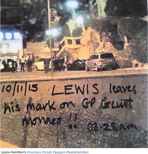 F1 world champion, Lewis Hamilton crashed his �1.5million Pagani Zonda while driving on a Monaco street a day before leaving for the Brazil Grand Prix