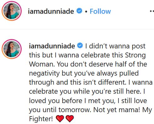 She wrote: "I didn’t wanna post this but I wanna celebrate this Strong Woman. You don’t deserve half of the negativity but you’ve always pulled through and this isn’t different. I wanna celebrate you while you’re still here. I loved you before I met you, I still love you until tomorrow. Not yet mama! My Fighter!"