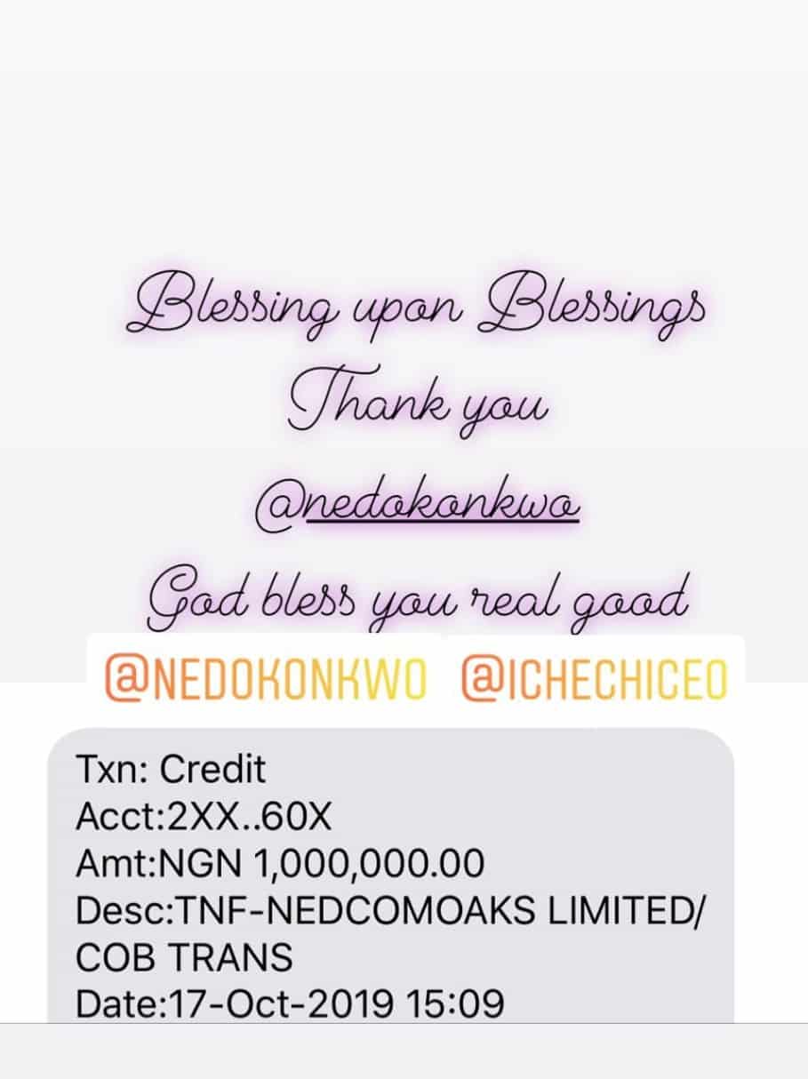 Frodd shared the good news via his Instagram page. He posted a screenshot of the credit alert of N1million from Mr. Ned Okonkwo.