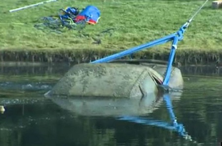 The car being pulled out of the pond