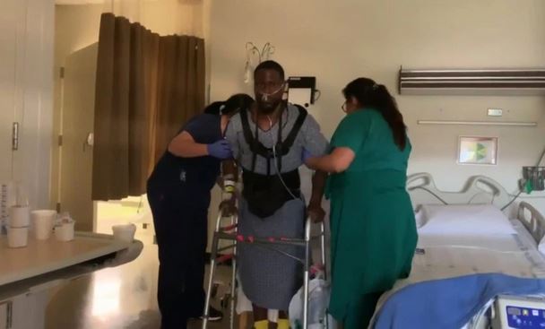 Nurses are seen helping him and he is using a walking frame to stand up.