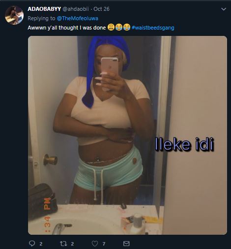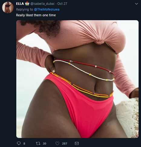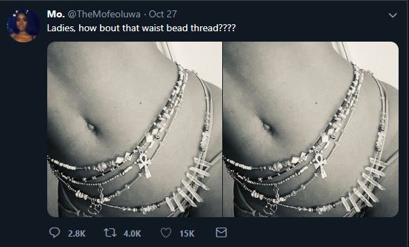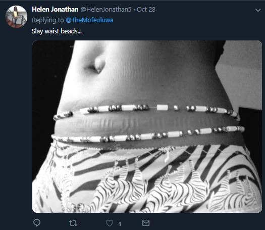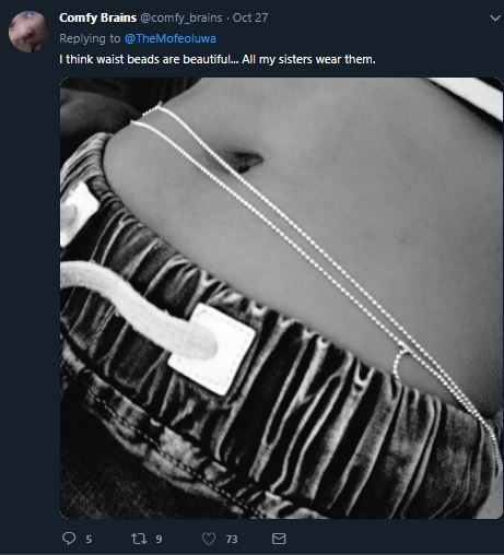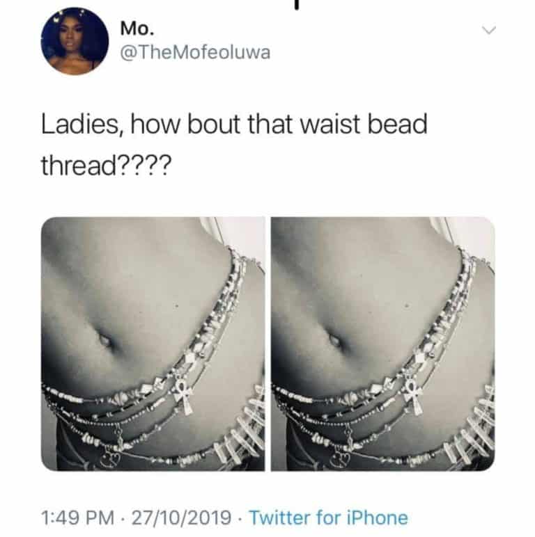 It all started when a Twitter user who is also a Chemical Engineer, Mofeoluwa asked ladies to send in pictures of their waist beads to the platform and even volunteered to share the photos for those who are not bold enough.