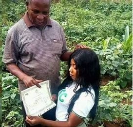 The young girl on passing out dashed off to his farm to show off her certificate. The smile on the face of her father is priceless and he used that opportunity to say some words of prayers for her.
