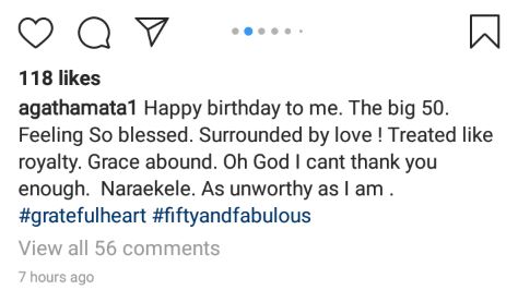 Media personality, Agatha Amata, is in a celebratory mood as she turns 50 today November 4th.