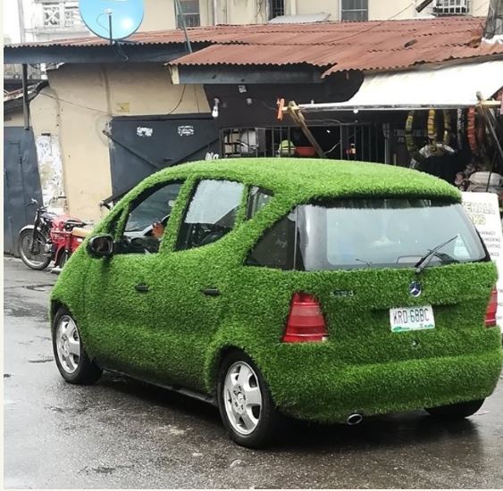 According to an eyewitness, this car covered with grass was spotted in Surulere, Lagos state.
