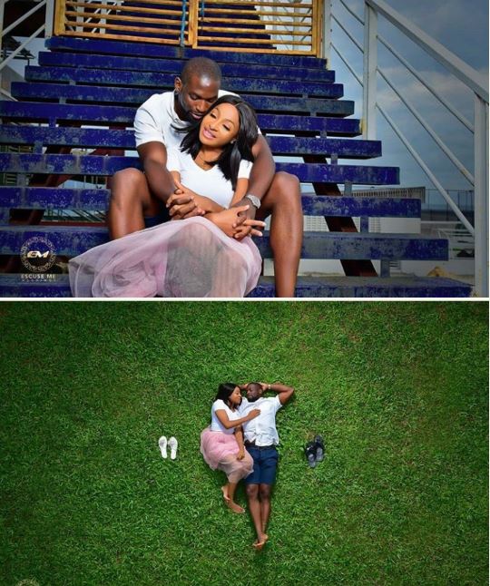 A beautiful Nigerian lady excitedly sits on top her husband-to-be as he does push-up exercise in colourful pre-wedding photoshoot.