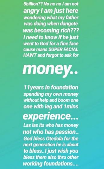 “N5billion!!! No no no I am not angry I am just here wondering what my father was doing when Dangote was becoming rich??? I need to know if he just went to God for a fine face cause man is super facial hawt and forgot to ask for money,” she wrote.