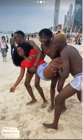 The Pepper Dem housemate was having a beach hangout with the popular red carpet host when some of the beach goers decided to join in on the fun.