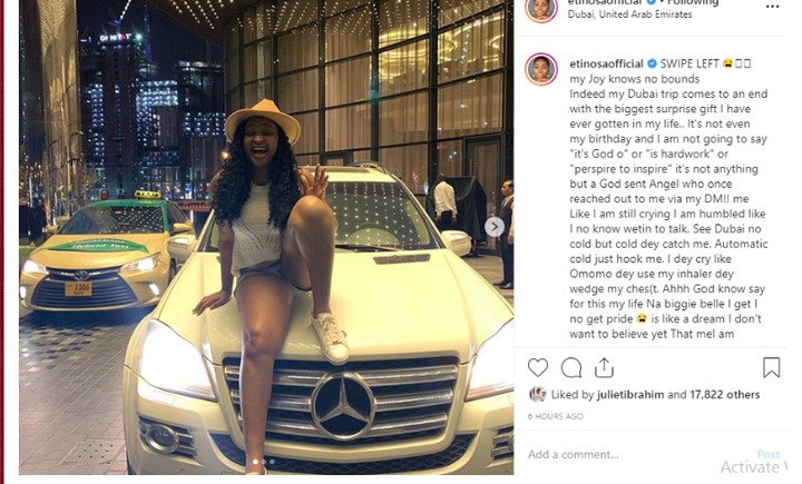 Nollywood actress and commediene, Etinosa took to her instagram page to share photos of a Mercedes Benz car gift she got after she replied a DM.