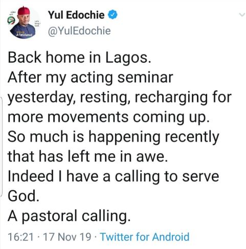 The actor cum politician made this announcement of becoming a pastor via his social media page. He wrote: