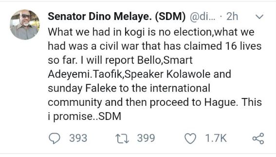 He said: "What we had in kogi is no election, what we had was a civil war that has claimed 16 lives so far. I will report Bello, Smart Adeyemi, Taofik, Speaker Kolawole and Sunday Faleke to the international community and then proceed to Hague. This i promise..SDM"