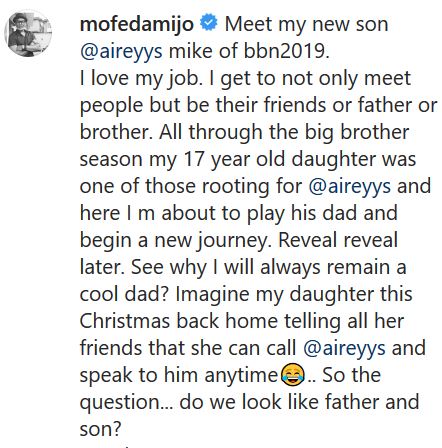 "All through the big brother season my 17 year old daughter was one of those rooting for @aireyys and here I m about to play his dad and begin a new journey. Reveal reveal later. See why I will always remain a cool dad?